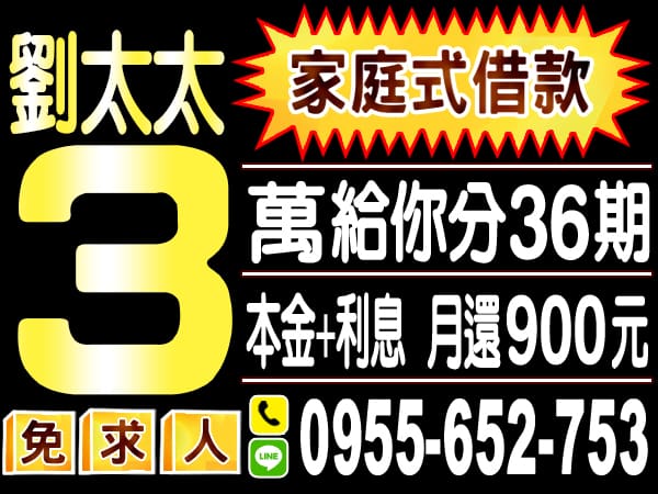 新 北 借 錢 ▼ 台北借錢 新北借錢 基隆借錢 桃園借錢 新竹借錢 苗栗借錢 台中借錢 彰化借錢 南投借錢 雲林借錢 嘉義借錢 台南借錢 高雄借錢 屏東借錢 宜蘭借錢 花蓮借錢 台東借錢 離島借錢 關閉 台北借錢 新北借錢 1-100萬,借錢找我 家庭式借款,免求人 5萬內現金,輕鬆借 週轉應急,輕鬆償還 24H,貸款好輕鬆 各行各業,借錢好商量 借貸款 注意事項 1、年齡要求:各類借款皆需滿20歲以上。2、貸款利率:貸款年利率2%-18%,依照借款人提供的自身條件不同而異,再由借貸雙方協議後訂定最終利率。3、還款期限:最低3個月,最長180個月,依照借貸雙方協議而訂。4、借款案例:A君急需現金30萬元,經多方比較利率後選定金主,雙方簽定於36個月內須還清借款,年利率6%計算,手續費:3000元,每期還款金額9127元,最後一期9111元,總還款金額新台幣328,556元。