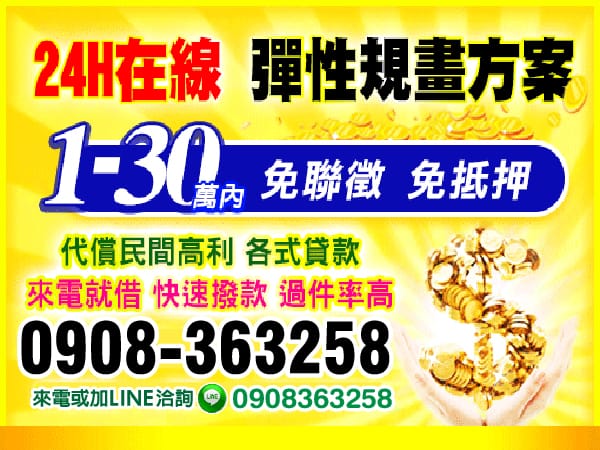 台 南 借 錢 ▼ 台北借錢 新北借錢 基隆借錢 桃園借錢 新竹借錢 苗栗借錢 台中借錢 彰化借錢 南投借錢 雲林借錢 嘉義借錢 台南借錢 高雄借錢 屏東借錢 宜蘭借錢 花蓮借錢 台東借錢 離島借錢 關閉 雲林借錢 嘉義借錢 台南借錢 20萬內,借錢找我 1-30萬,借還真輕鬆 讓我們協助您,借錢找我 10萬借款,來就借 1-20萬,貸款好輕鬆 輕鬆貸款,免煩惱 借貸款 注意事項 1、年齡要求:各類借款皆需滿20歲以上。2、貸款利率:貸款年利率2%-18%,依照借款人提供的自身條件不同而異,再由借貸雙方協議後訂定最終利率。3、還款期限:最低3個月,最長180個月,依照借貸雙方協議而訂。4、借款案例:A君急需現金30萬元,經多方比較利率後選定金主,雙方簽定於36個月內須還清借款,年利率6%計算,手續費:3000元,每期還款金額9127元,最後一期9111元,總還款金額新台幣328,556元。