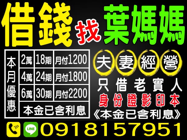 桃 園 借 錢 ▼ 台北借錢 新北借錢 基隆借錢 桃園借錢 新竹借錢 苗栗借錢 台中借錢 彰化借錢 南投借錢 雲林借錢 嘉義借錢 台南借錢 高雄借錢 屏東借錢 宜蘭借錢 花蓮借錢 台東借錢 離島借錢 關閉 桃園借錢 新竹借錢 苗栗借錢 來電就借 快速撥款 本利攤還 身分證影本 只借老實人 機車借款 轉貸降息 代償高利 快速撥款,輕鬆週轉 分期攤還,息低保密 健保卡借款,超優惠 借貸款 注意事項 1、年齡要求:各類借款皆需滿20歲以上。2、貸款利率:貸款年利率2%-18%,依照借款人提供的自身條件不同而異,再由借貸雙方協議後訂定最終利率。3、還款期限:最低3個月,最長180個月,依照借貸雙方協議而訂。4、借款案例:A君急需現金30萬元,經多方比較利率後選定金主,雙方簽定於36個月內須還清借款,年利率6%計算,手續費:3000元,每期還款金額9127元,最後一期9111元,總還款金額新台幣328,556元。